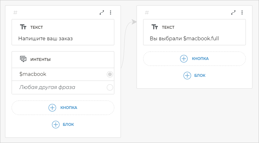 Теперь можно добавить в сценарий бота блок Интенты и указать Хочу заказать $product в качестве примера фразы.