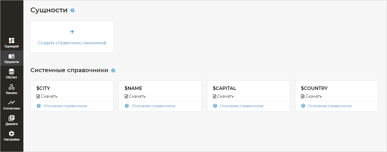 Управлять пользовательскими справочниками можно на странице Сущности в редакторе бота. Здесь находится список системных справочников и кнопка Создать справочник синонимов.