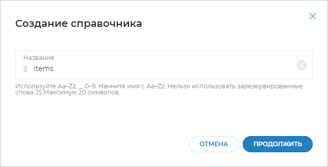 Нажатие на кнопку открывает окно создания справочника. Здесь нужно придумать имя для справочника.