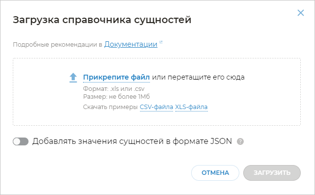 Чтобы загрузить файл с сущностями, нажмите кнопку Загрузить справочник. В открывшемся окне вы можете добавить файл с сущностями, где в первом столбце должна быть указана сама сущность, а в остальных столбцах этой же строки — ее синонимы.