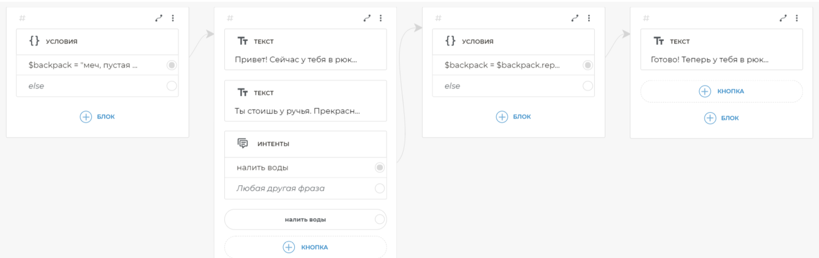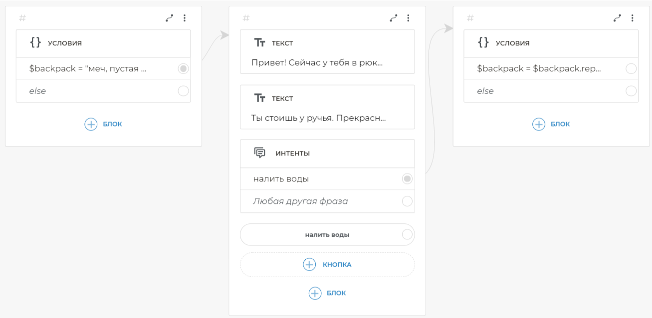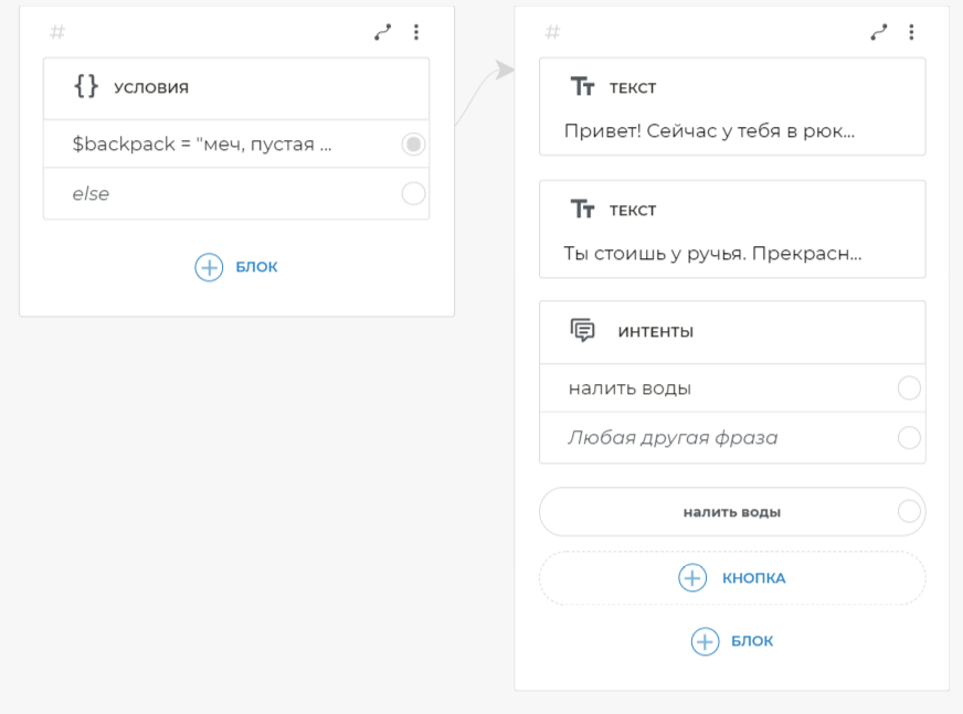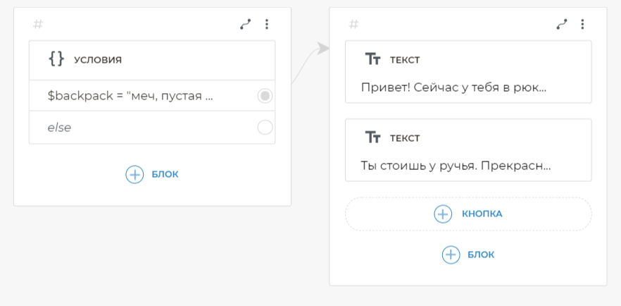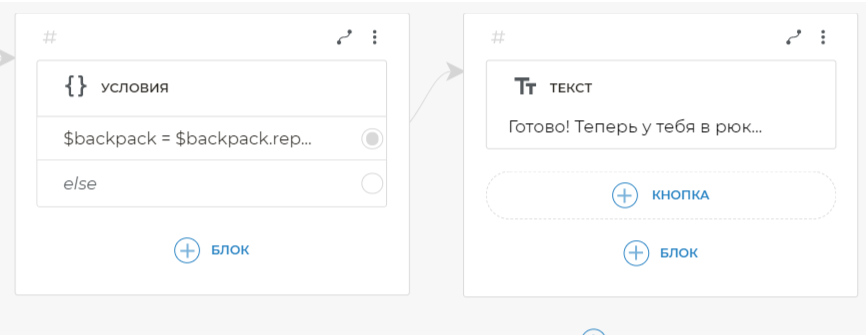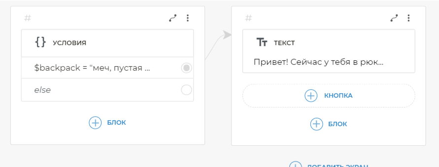 Свяжите условие со следующим экраном. Для связи условия со следующим экраном, добавьте на него блок Текст. Скопируйте и вставьте в блок Текст: