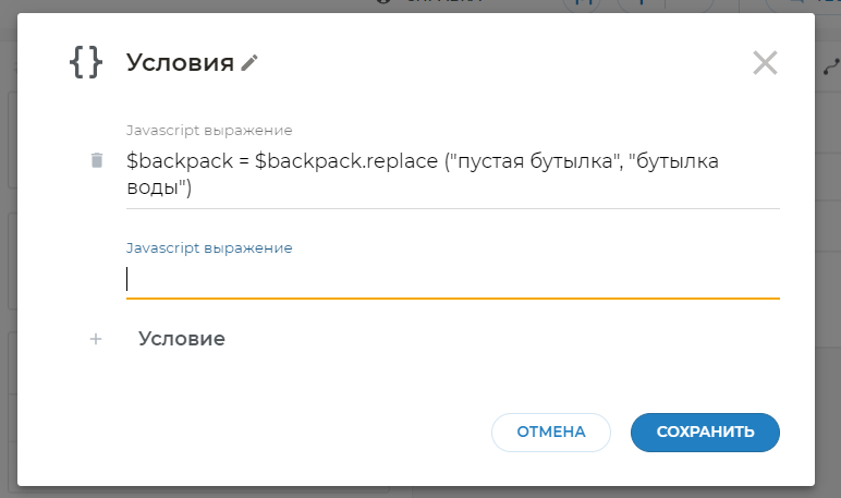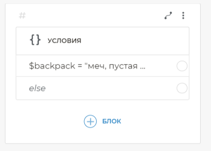 Добавим на него блок Условия. Скопируйте и вставьте в блок Условия следующее: