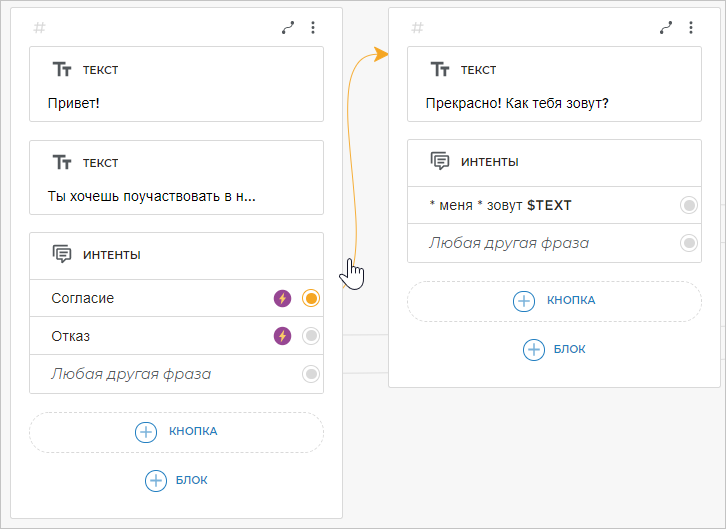 - Бот выполнит блок Интенты, то есть будет ждать реакции клиента и, в зависимости от ответа, выполнит следующее действие.
