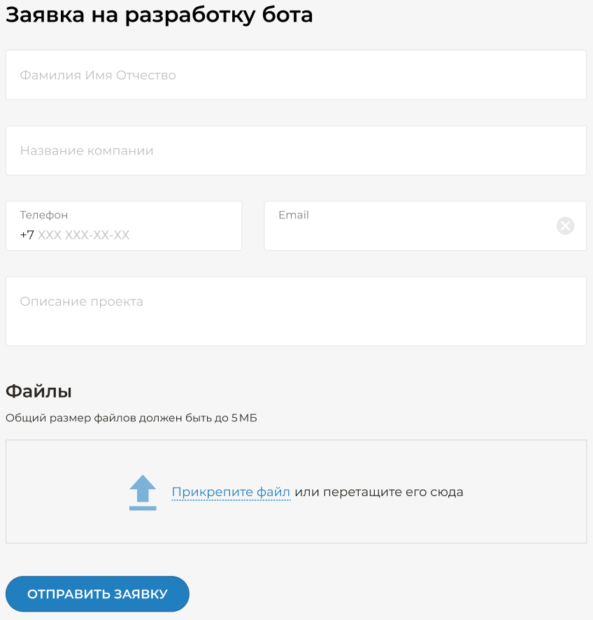 Заполните все поля, опишите, как вы представляете работу бота, прикрепите нужные документы (если вы, например, уже составили ТЗ для бота) и нажмите кнопку ОТПРАВИТЬ ЗАЯВКУ.