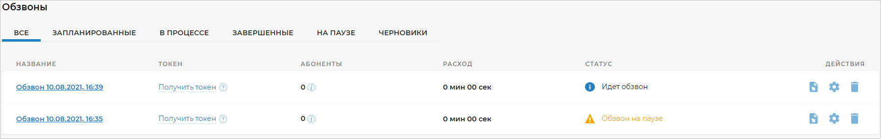 Чтобы узнать, сколько времени было потрачено на каждый обзвон, откройте вкладку Обзвоны в нужном вам сценарии. Вы увидите, сколько минут было потрачено на каждый обзвон, а также информацию о статусе обзвона.