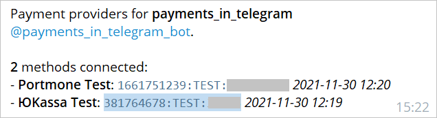 - Вернитесь в чат с BotFather. В последнем сообщении от BotFather вы увидите список интеграций выбранного бота с платежными системами. Скопируйте нужный токен: