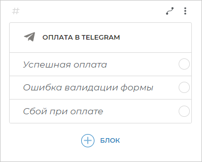 Блок Оплата в Telegram позволяет принимать платежи от пользователей Telegram при помощи встроенного сервиса платежей. Сервис поддерживает интеграцию с различными платежными системами.