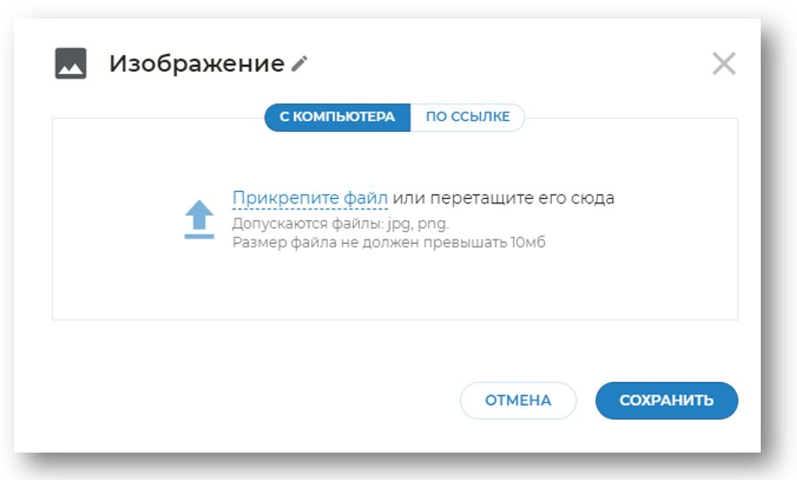 При добавлении блока выберите изображение с вашего компьютера. Изображение должно быть в формате .jpeg (.jpg), .png или .gif, весом не более 10Mb.