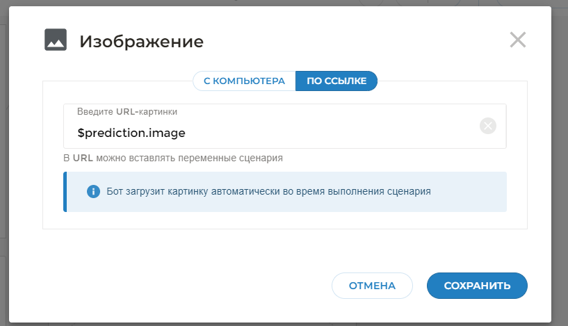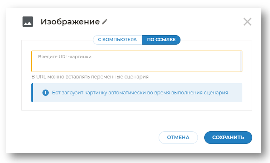 При добавлении изображения через ссылку в сценарии вы не сможете видеть само изображение. Это сделано, чтобы снизить нагрузку на Aimylogic: