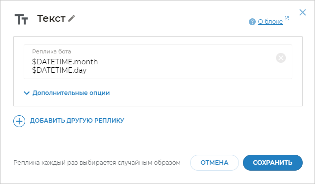 В параметрах блока можно указать один или несколько вариантов реплик, одну из которых бот будет выводить клиенту.