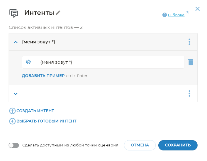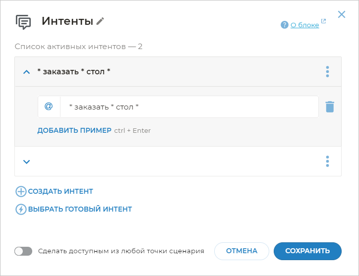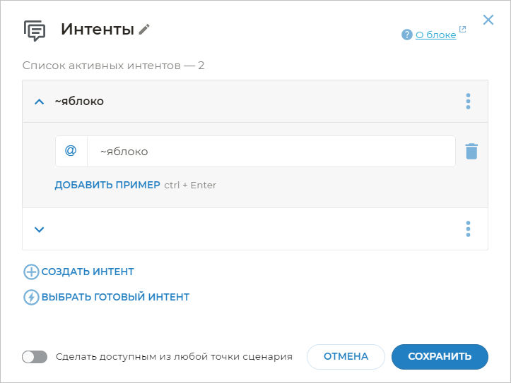 По умолчанию, когда вы переходите в редактирование блока Интенты и начинаете добавлять строки, они добавляются как примеры фраз, а не как шаблоны. Об этом свидетельствует иконка слева от каждой фразы. Чтобы сделать фразу шаблоном, нажмите на иконку напротив каждой фразы. Она изменится на иконку .