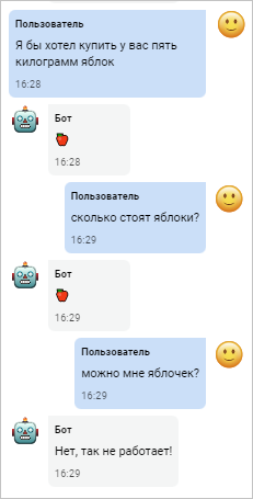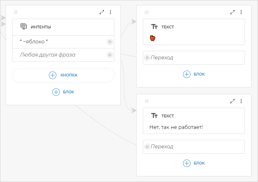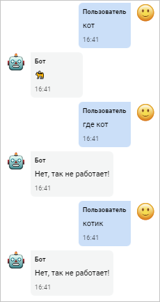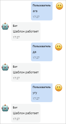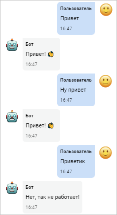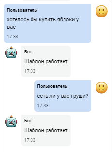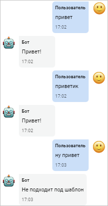 Этот шаблон, состоящий только из одного слова, позволяет боту реагировать только на точную фразу «привет». Если фраза будет отличаться хотя бы на один символ, она не будет распознана ботом.