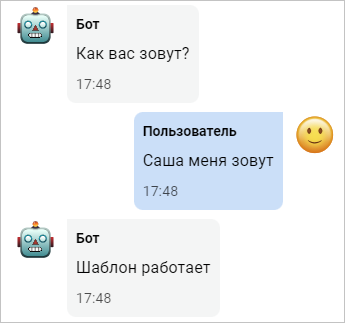 Шаблон {меня зовут *} сработает на ввод любой фраз, в которой обязательно есть слова «меня» и «зовут», а также два–три других слова вне зависимости от порядка. Например, шаблон сработает на фразы «меня зовут Саша», «Саша меня зовут» и так далее.