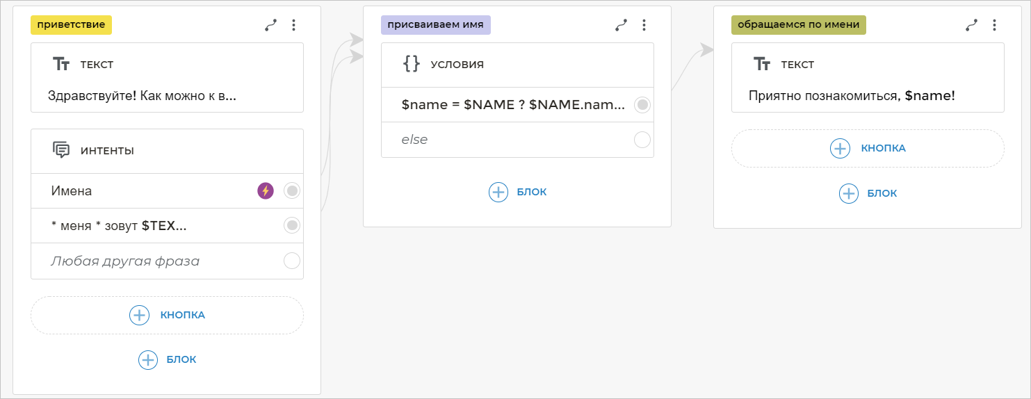 При общении с клиентом в первую очередь необходимо узнать его имя. Создание этого участка сценария подробно описано в отдельном уроке. Перейдите на страницу урока по запросу имени клиента и выполните все описанные в нем шаги.