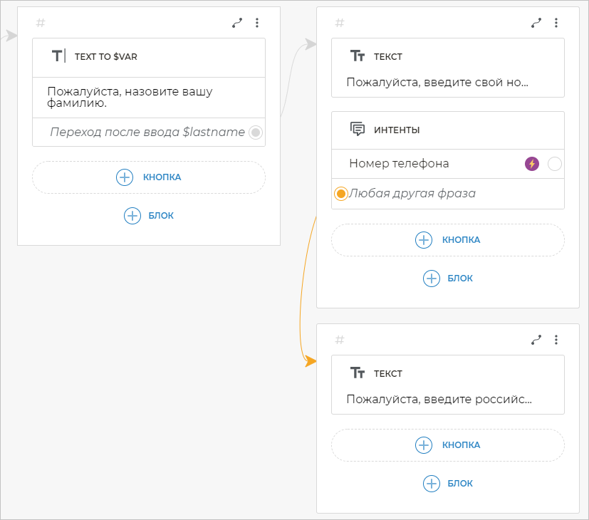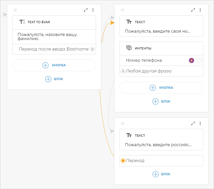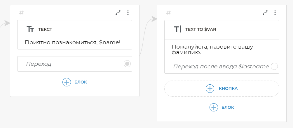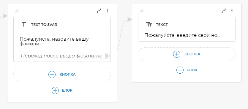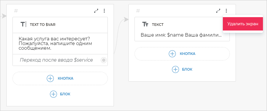 Теперь свяжем экран, где вы запрашивали фамилию, с новым экраном. Для этого кликните по строке Переход после ввода $lastname и создайте блок Текст, в котором напишите фразу: