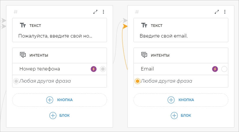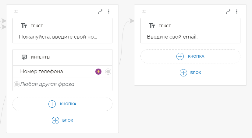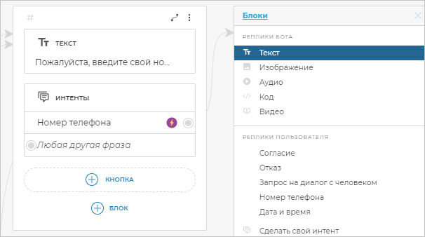 Сюда бот будет вести клиента, если он введет что-то, что не попадет в готовый интент Номер телефона.