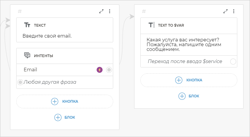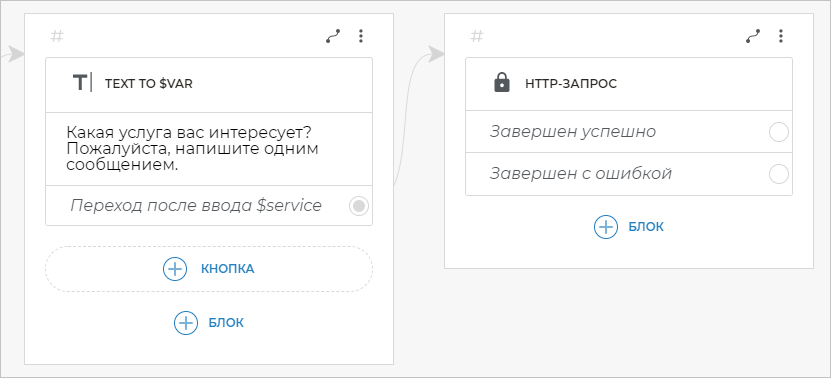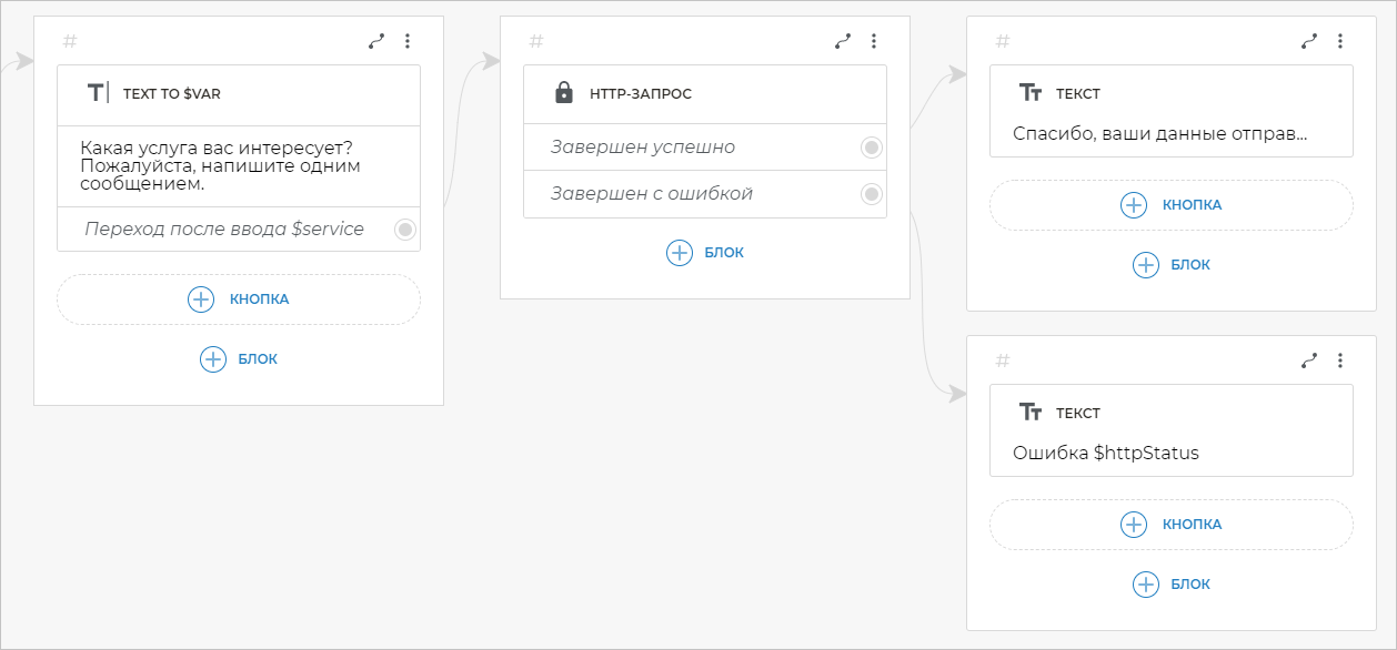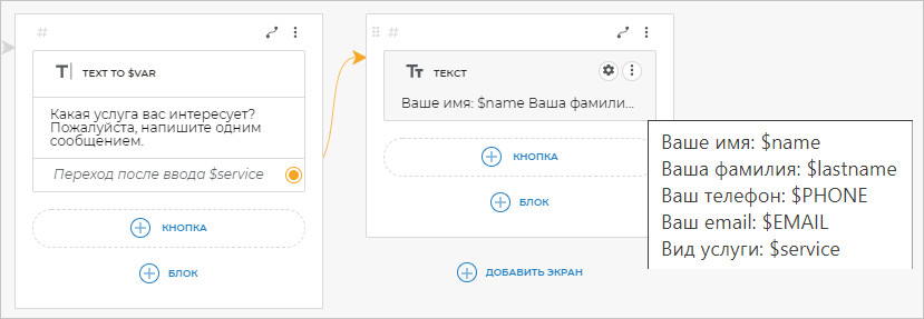 Для этого от варианта Переход после ввода $service добавьте связь с блоком Текст. Скопируйте следующий текст в созданный блок: