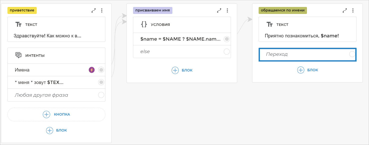 Чтобы связать готовый сценарий с новым блоком, добавьте на экран, содержащий текст Приятно познакомиться, $name!, блок Переход:
