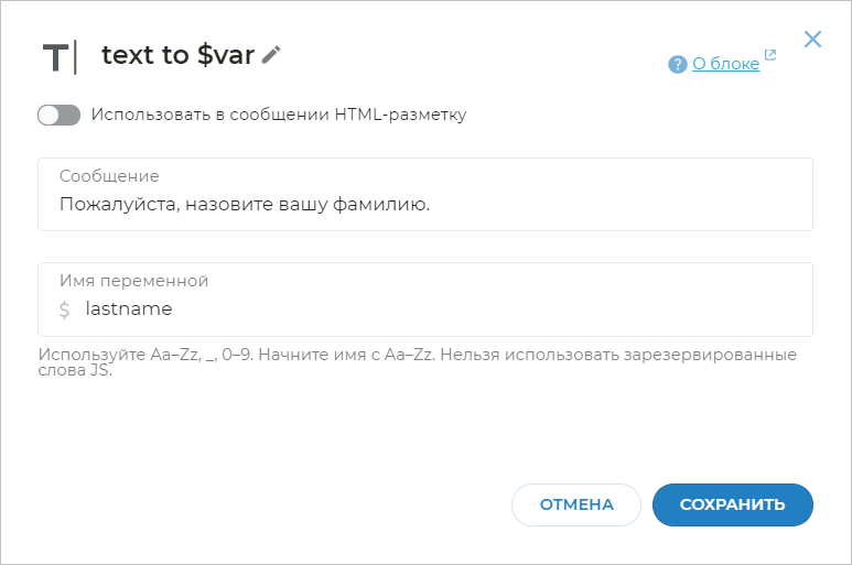 Так как фамилий может быть бесчисленное множество, нет смысла использовать словари фамилий. Воспользуемся блоком text to $var для того, чтобы получить любое слово, которое клиент введет в ответ на вопрос о фамилии, и сохранить его в переменную.