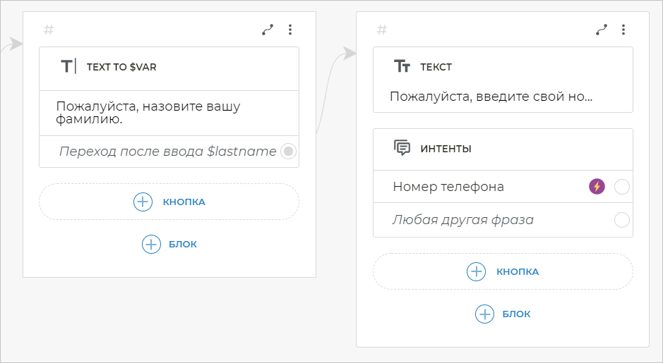 Если вам нужно получить от клиента ответ на какой-либо дополнительный вопрос — выяснить, какая услуга его интересует, на какой адрес доставить товар, какое время удобно для звонка и т. п. — вы можете получить эту информацию с помощью еще одного блока text to $var.