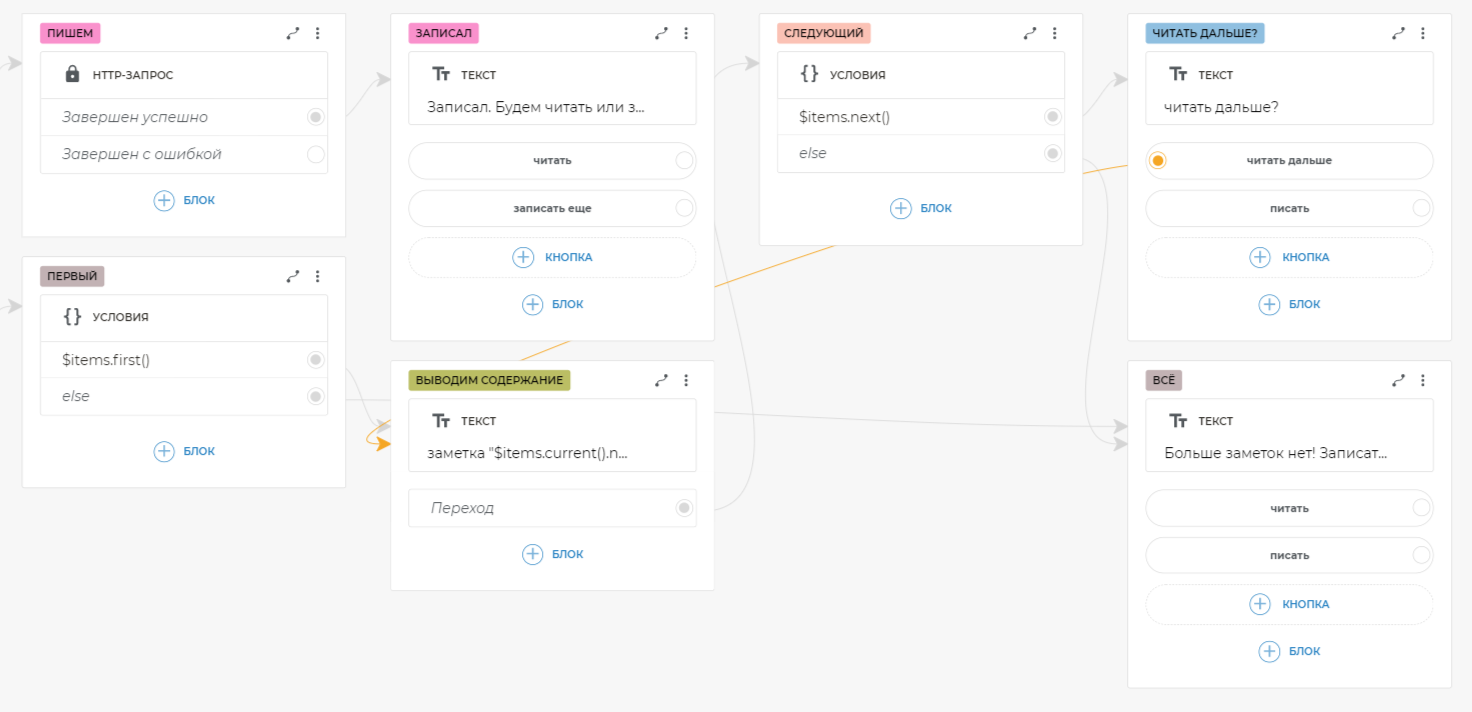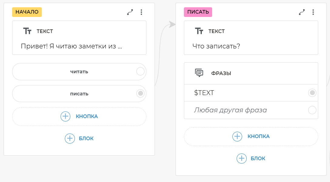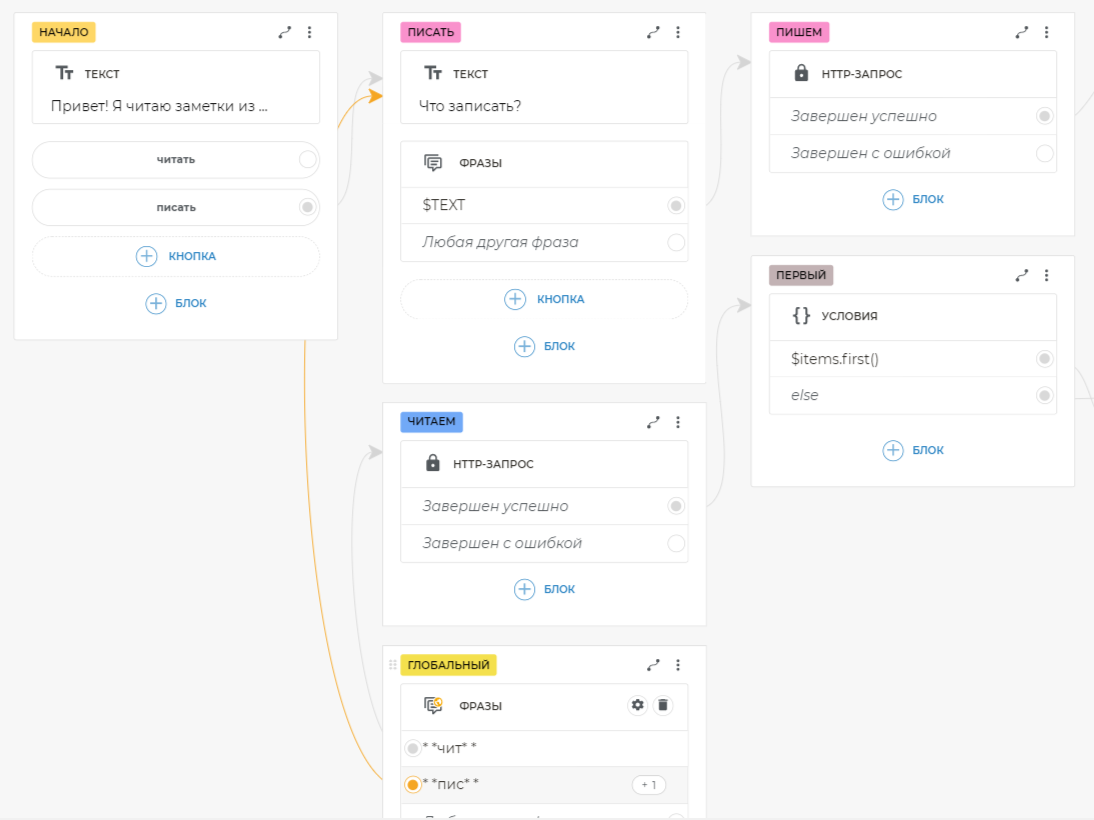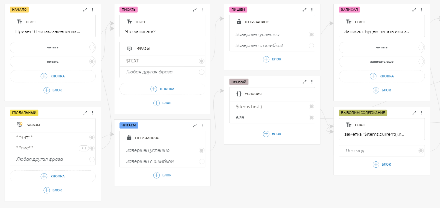 Таким образом, вы можете из любого места сценария попросить бота записать или прочитать заметки, и он среагирует соответствующе на разные формулировки. После добавления глобального блока фраз вам больше не нужно связывать кнопки, на которых есть текст, попадающий в шаблон.