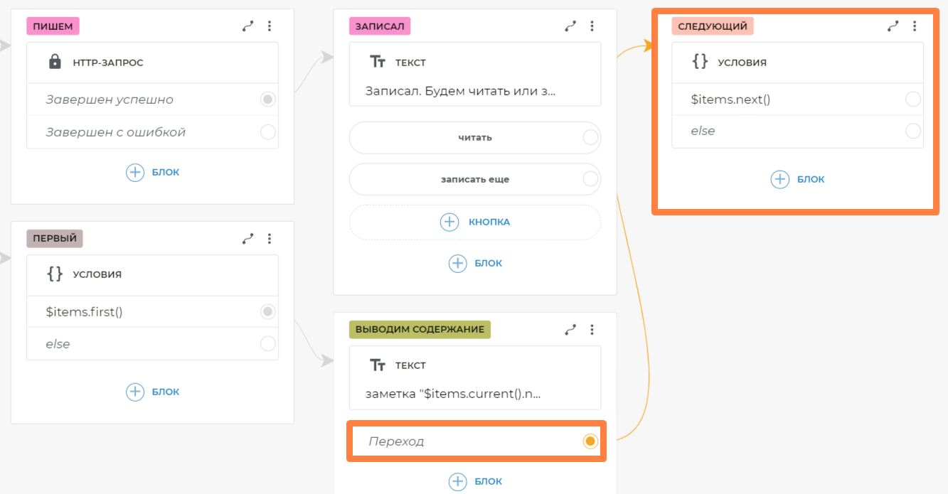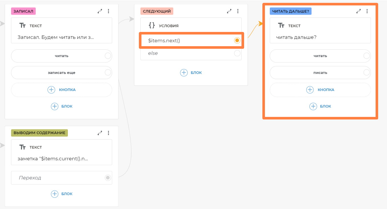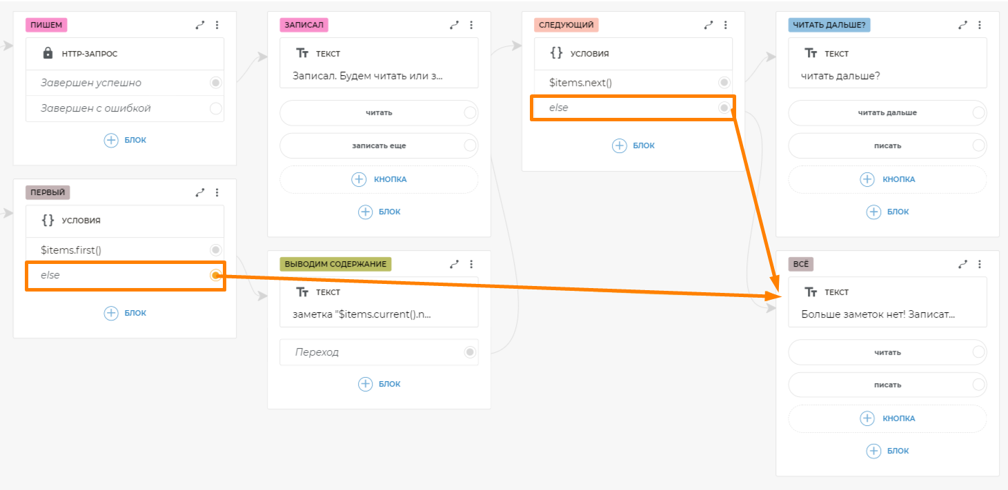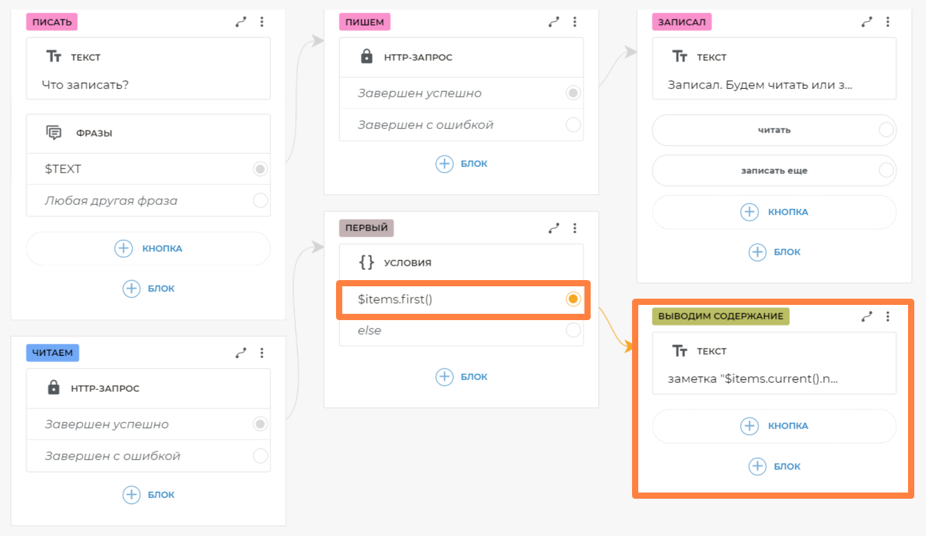 Таким образом, вы можете из любого места сценария попросить бота записать или прочитать заметки, и он среагирует соответствующе на разные формулировки. После добавления глобального блока фраз вам больше не нужно связывать кнопки, на которых есть текст, попадающий в шаблон.