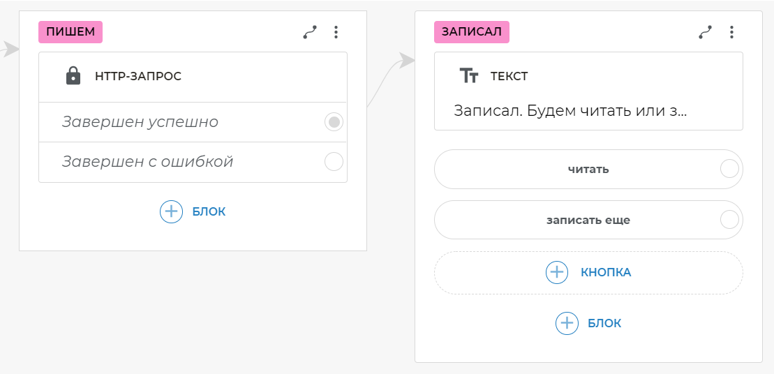 От варианта Завершен успешно Http-запроса протяните связь и создайте текстовый блок, на котором разместите сообщение об успешной записи: Записал. Будем читать или записать еще одну?