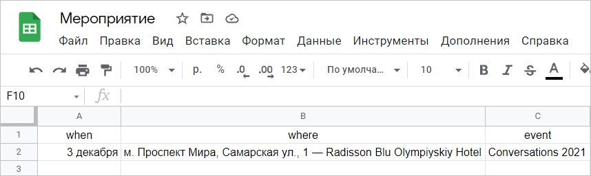 В этой папке создайте Google Таблицу, например, «Мероприятие». Название вам также понадобится в дальнейшем.