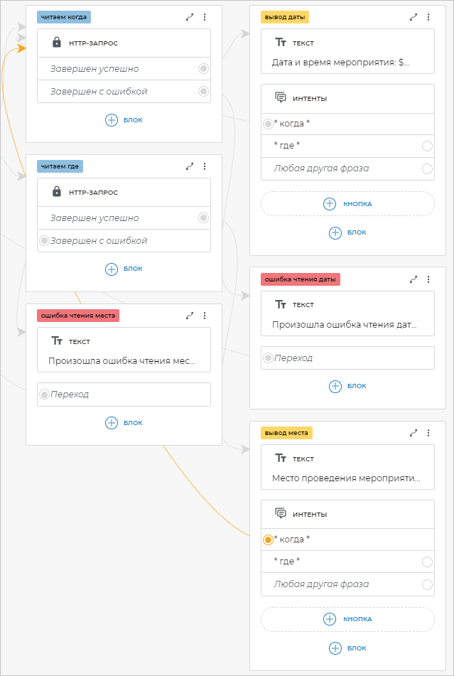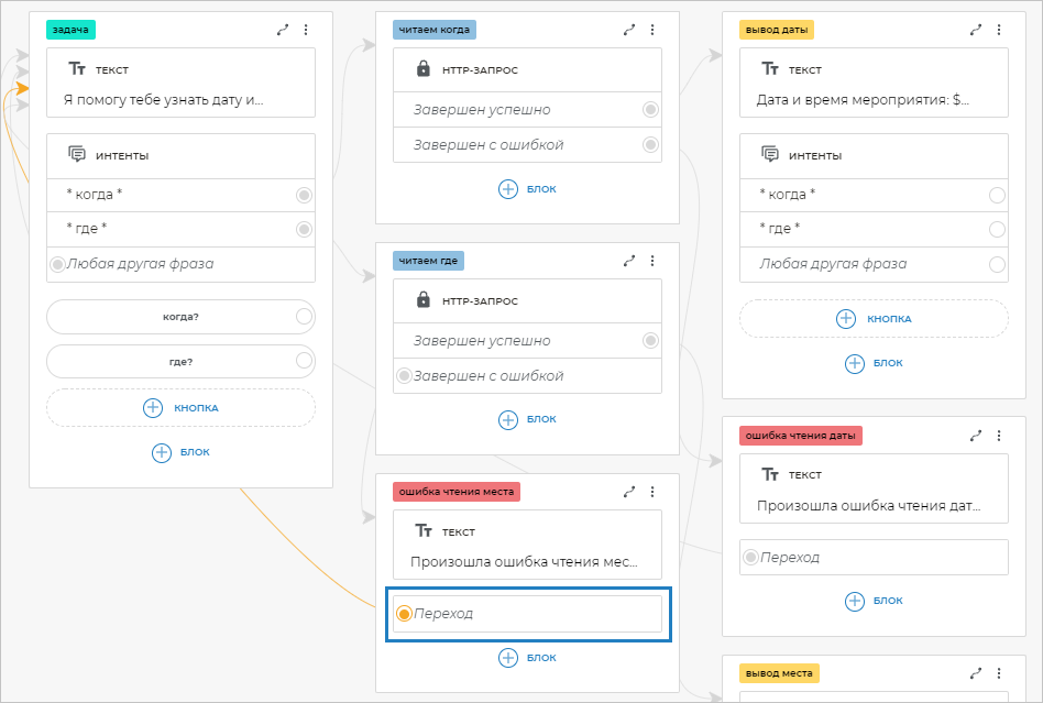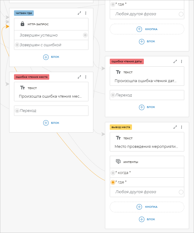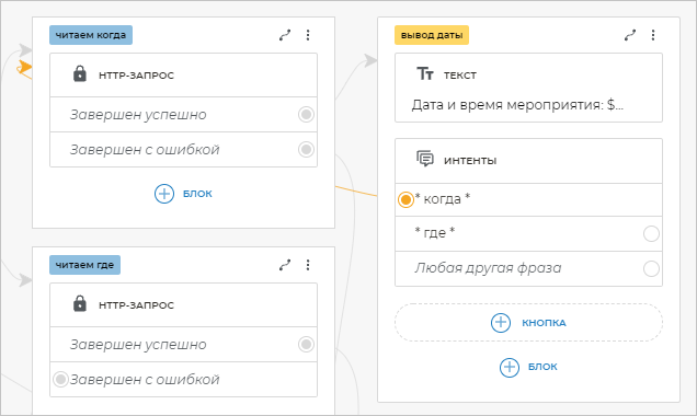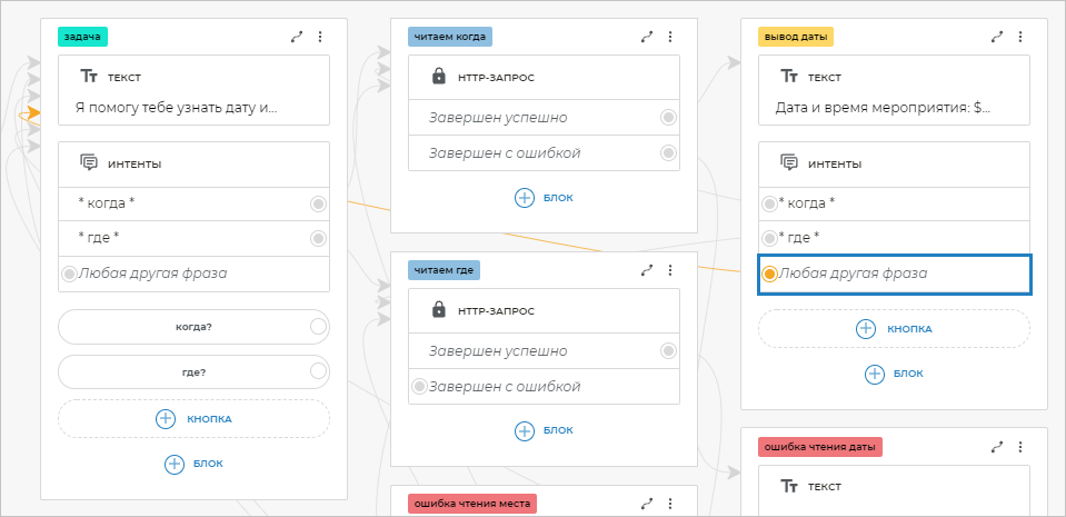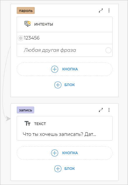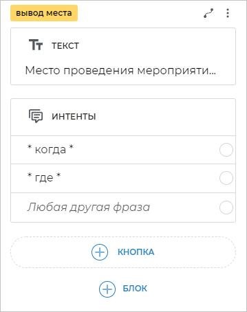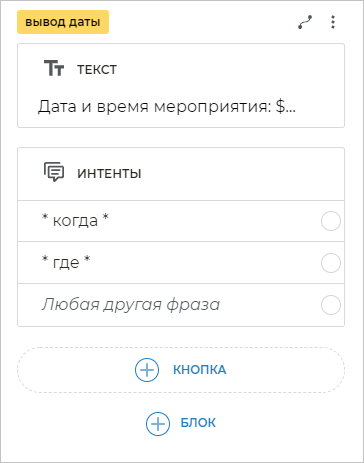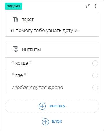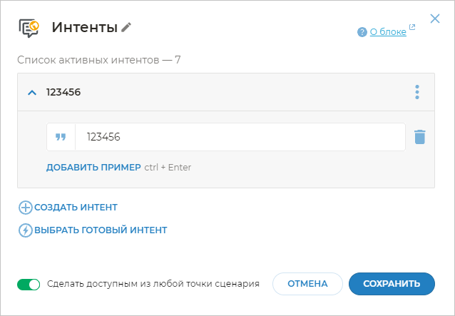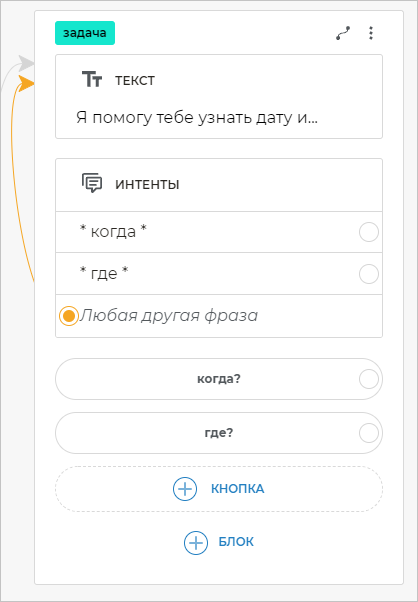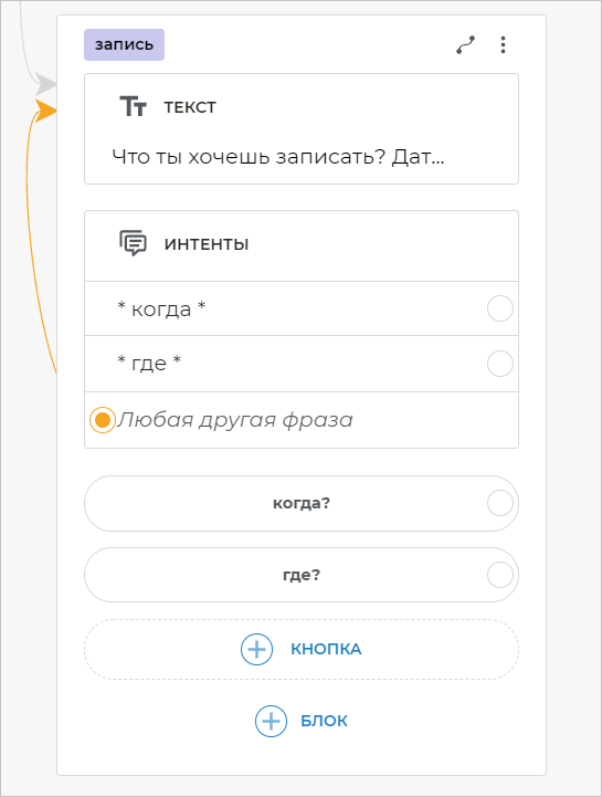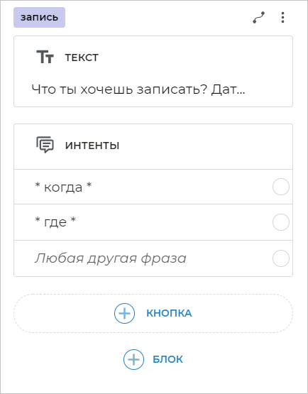Чтобы бот распознавал фразы клиента, в которых содержатся определенные слова, необходимо добавить шаблоны этих фраз. Для этого добавьте блок Интенты и вставьте