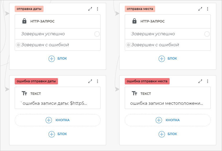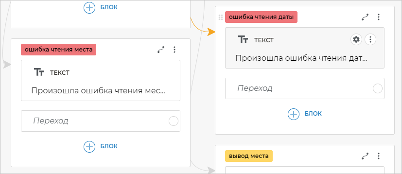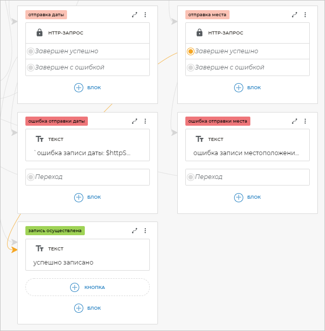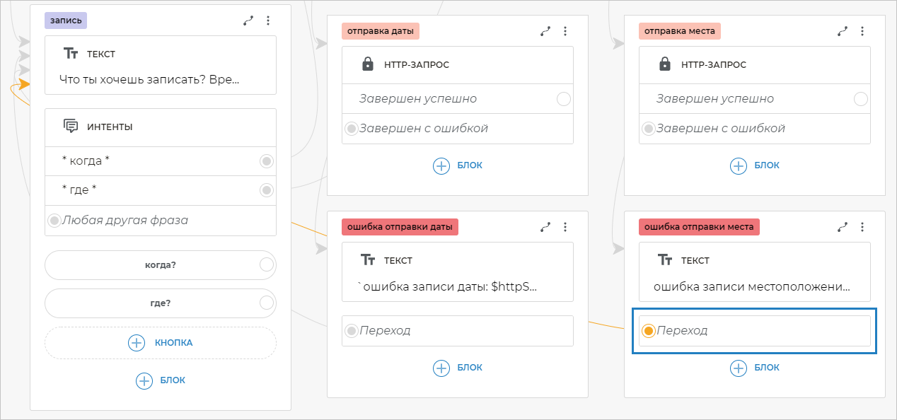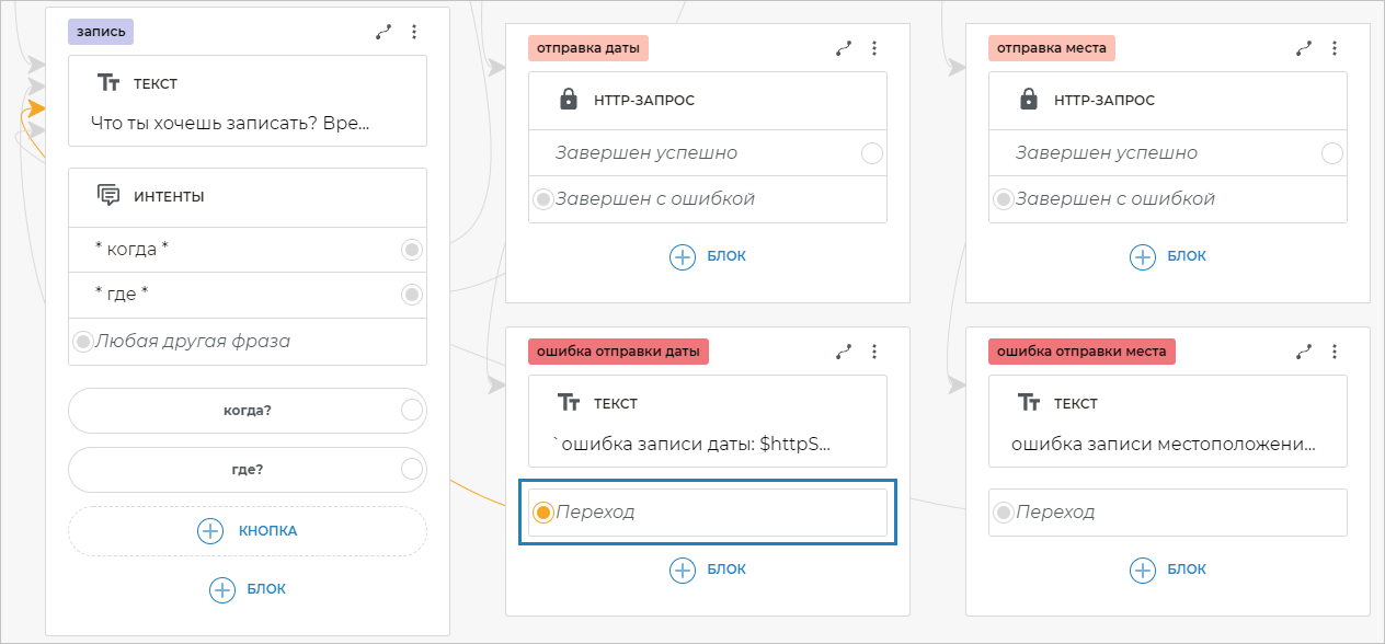 На оба экрана «ошибка отправки даты» и «ошибка отправки места» добавьте блоки Переход и свяжите их с экраном «запись».