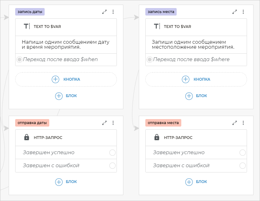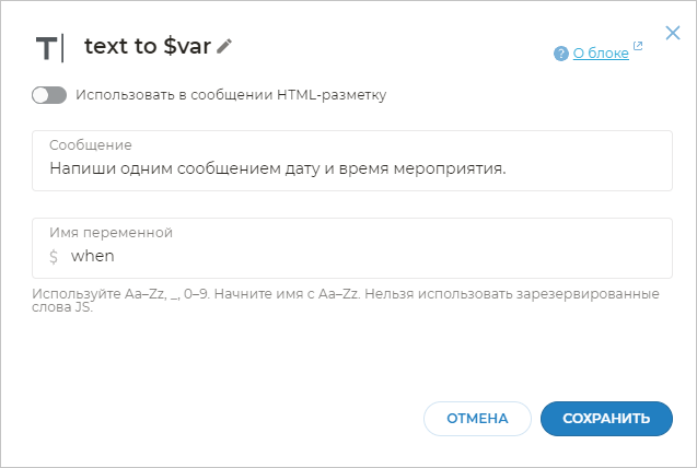 Напиши одним сообщением дату и время мероприятия. - В поле Имя переменной укажите