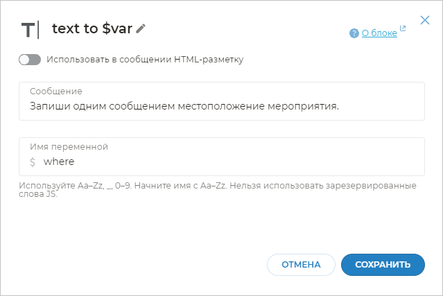 Запиши одним сообщением местоположение мероприятия. - В поле Имя переменной укажите