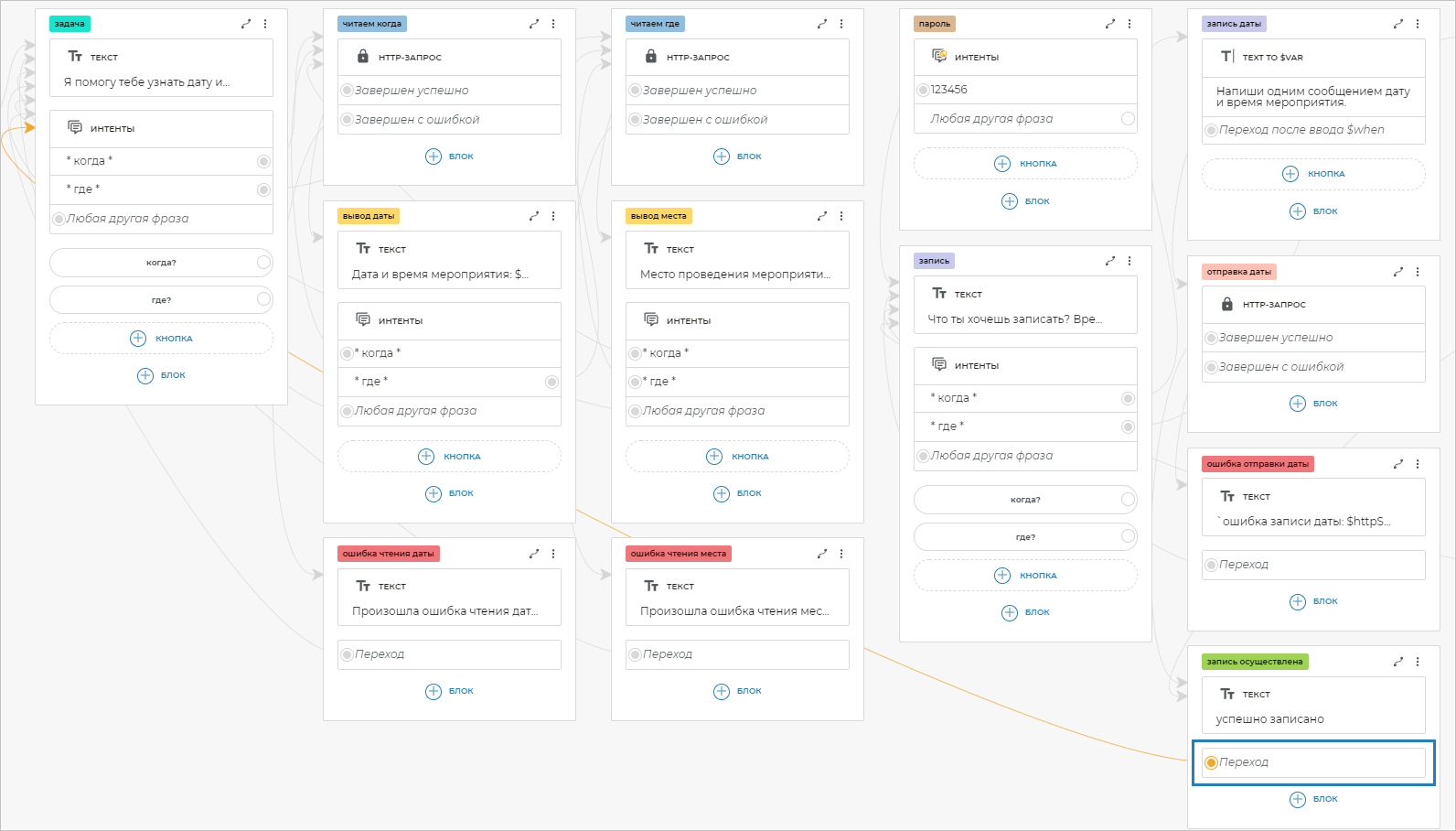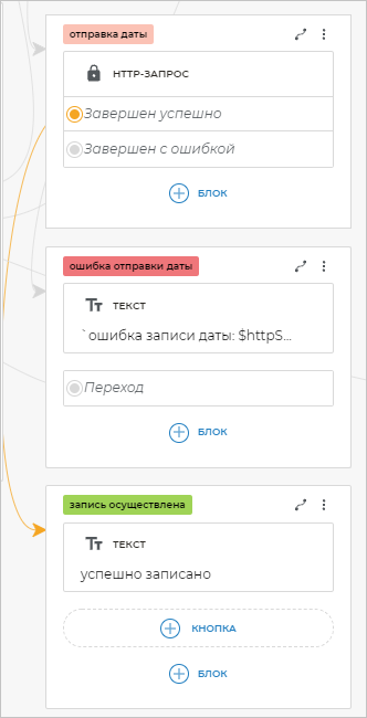 Добавьте на экран «запись осуществлена» блок Переход и свяжите его с экраном «задача».