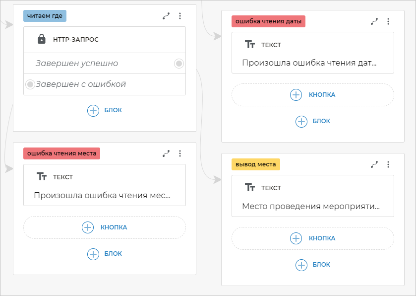 От варианта Завершен с ошибкой запроса на экране «читаем где» создайте новый экран с блоком Текст: