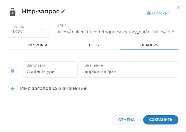 Content-Type, а в значенииapplication/json. Сохраните блок.