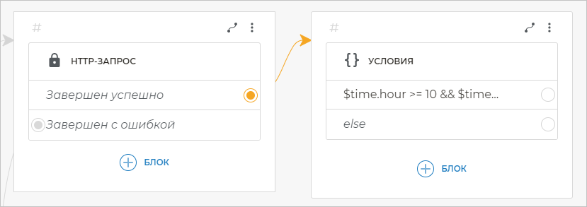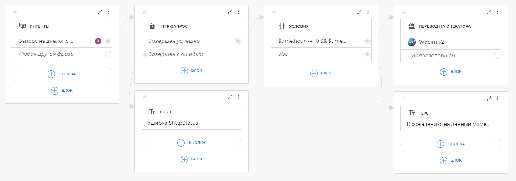 Если условие $time.hour >= 10 && $time.hour < 19 && $time.weekDay <= 5 верно, это означает, что сейчас рабочее время. Так как в этом примере мы хотим, чтобы в рабочее время с клиентами общались операторы, свяжите данное условие с блоком Перевод на оператора.