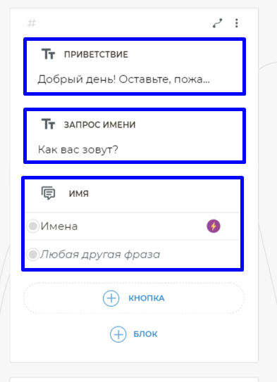 Например, на этом скриншоте три блока: два блока Текст и один блок Интент: