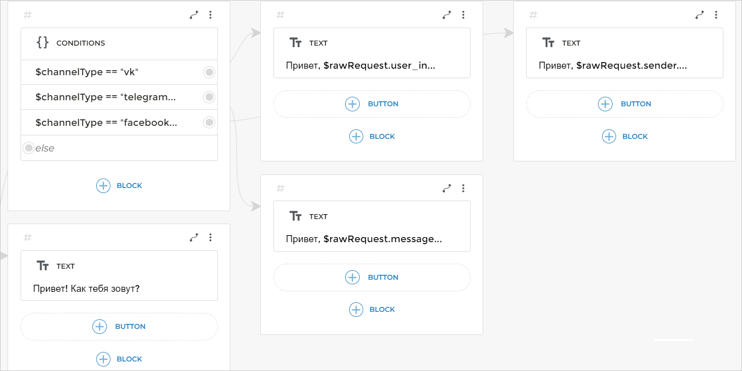 $rawRequest. - В качестве условий добавьте выражение для каждого канала, подключенного к боту. Например, если у вас подключены каналы Telegram и ВКонтакте, добавьте следующие условия: