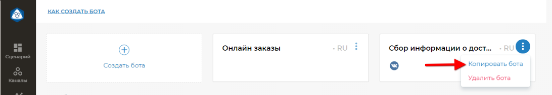 Скопировать бота можно, нажав на опцию Копировать бота в выпадающем меню: