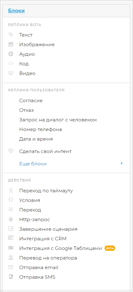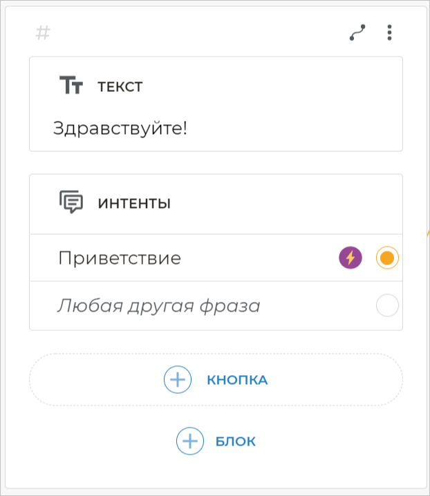 Блоки — это «кирпичики», из которых строится логика работы сценария. Каждый из блоков — это какое-либо действие, которое совершает бот: приветствие клиента, отправка изображения или распознавание того, что клиент хочет сделать заказ.