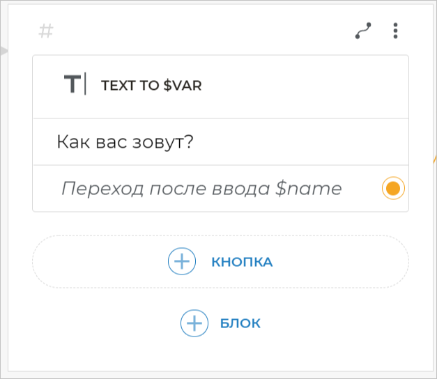 Для этого добавьте новый экран с блоком text to $var, который находится в подменю Еще блоки. С его помощью полученное от клиента имя сохранится в переменную, которую можно будет далее использовать в любом месте сценария.