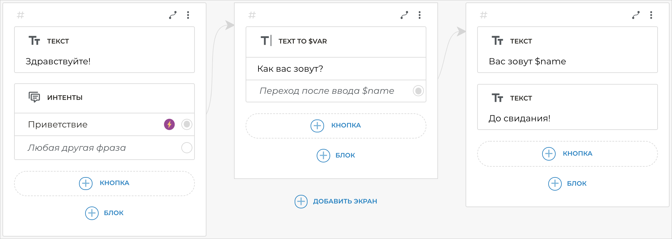 Блоки добавляются на экраны. Каждый экран — это состояние бота, в котором он совершает действие или ряд действий.