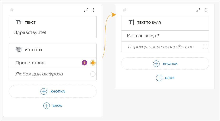 Теперь у вас в сценарии есть два экрана, но они пока не соединены между собой. Так как бот должен спросить имя клиента только после того, как клиент поздоровается, соедините интент Приветствие со вторым экраном, на котором бот задает клиенту вопрос.