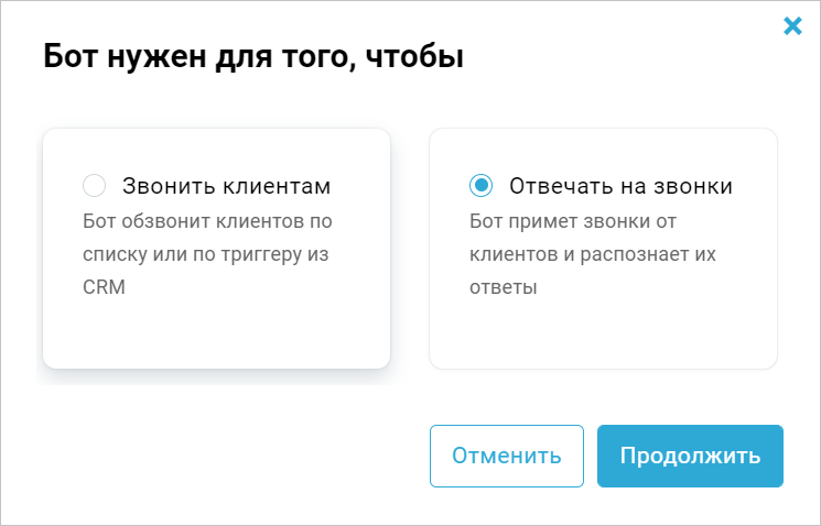 1. Выберите вкладку ЗвонкиСоздать ботаОтвечать на звонкиПродолжить: