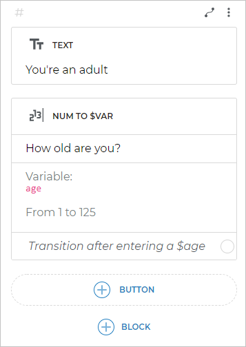 For example, the num to $var block will save the number client enters to the $number variable: