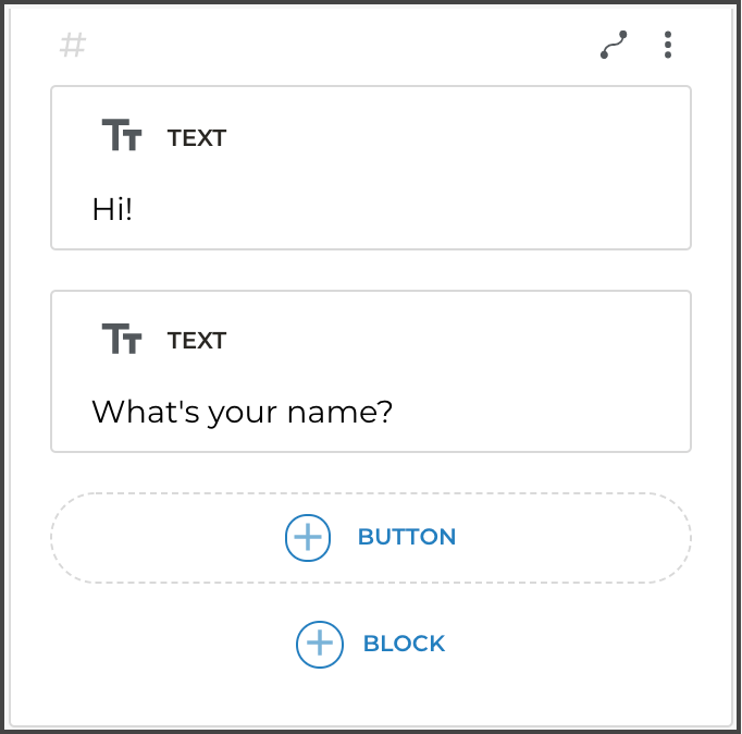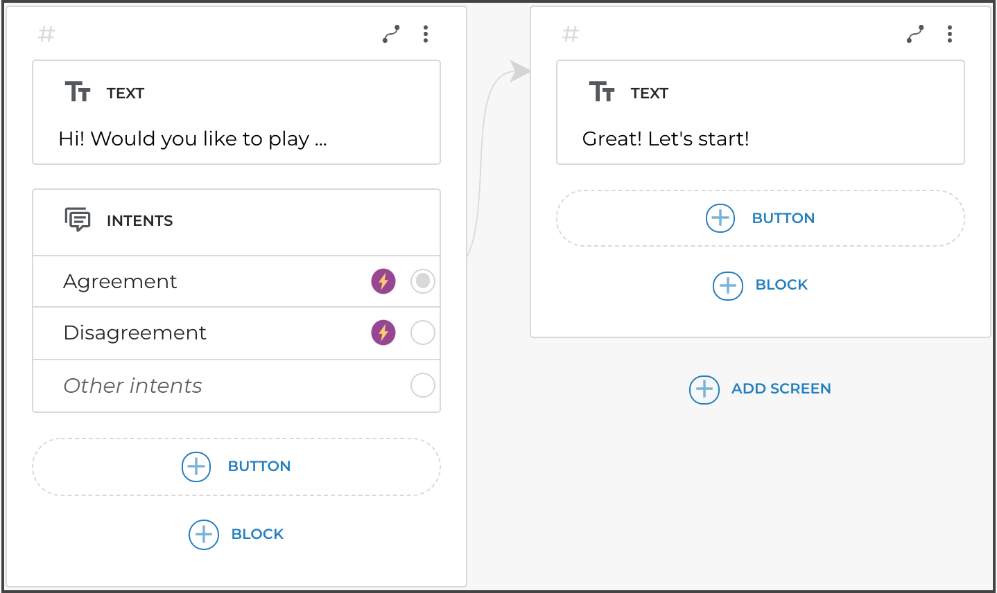To create a new screen, hover over an empty space in your script, click “+ SCREEN” and select a block. A screen that contains one block will be created. You can later add more blocks to this screen if necessary.