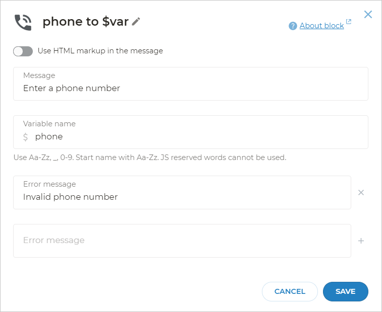 The phone number will be saved into the $phone variable. Also, you can name the variable as you want when adding a block.