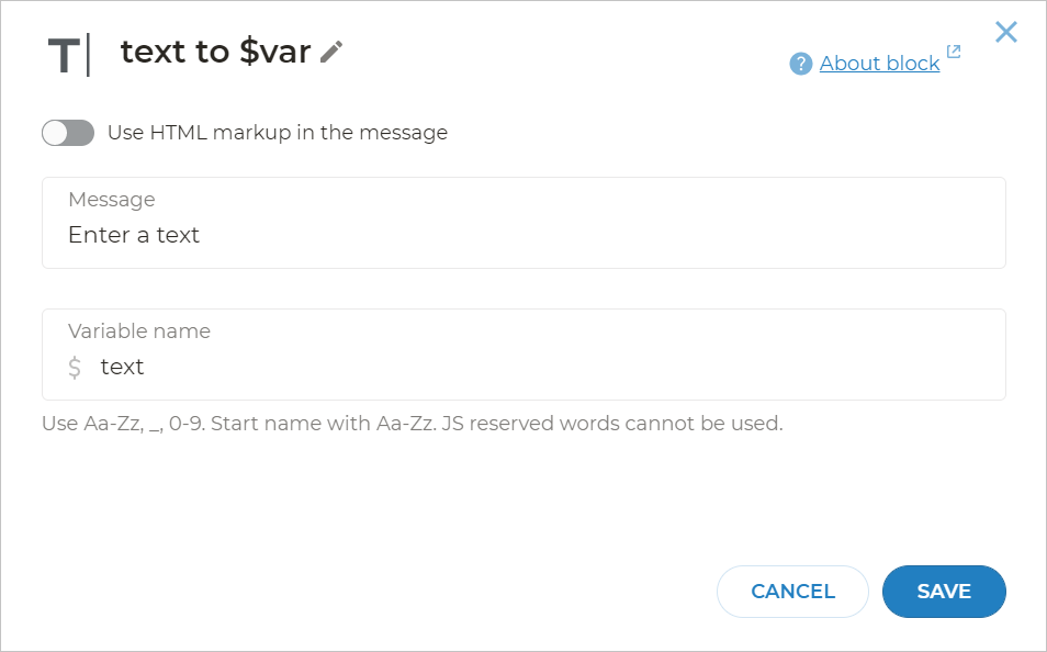 The text to $var block is used to receive some text from the client and save it to a variable.