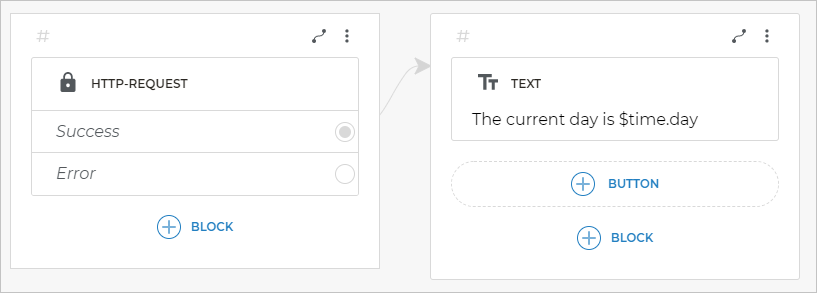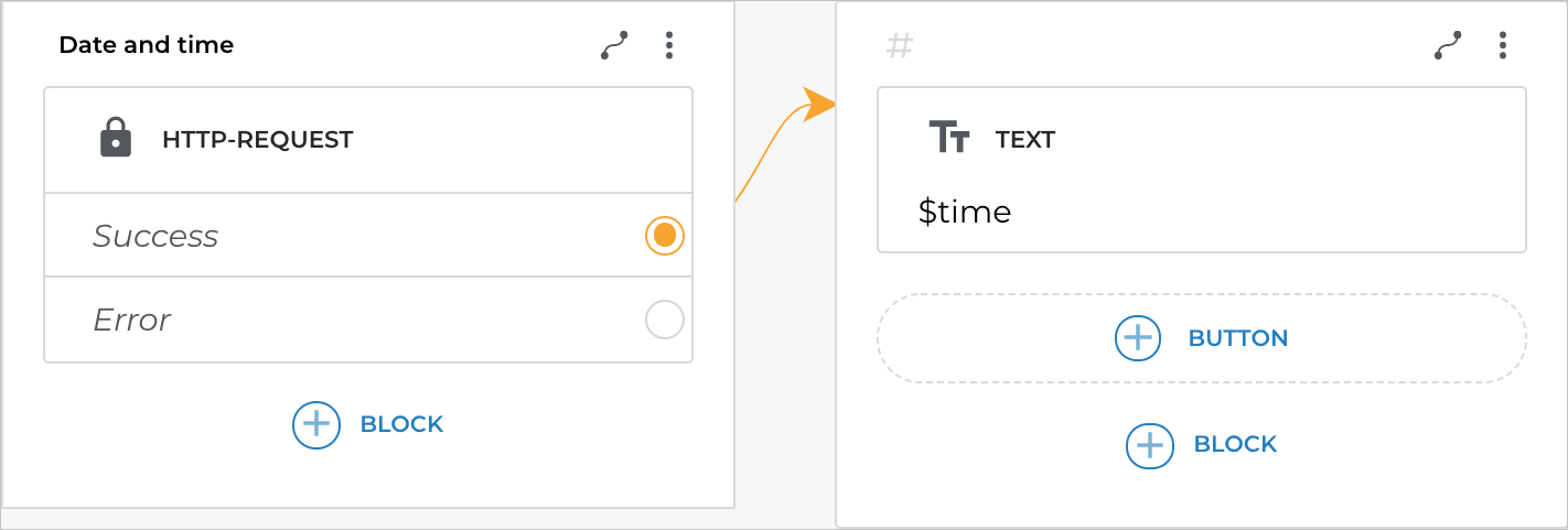 For example, you can connect the Success option in the HTTP request block with a Text block that contains the $time variable.