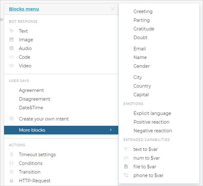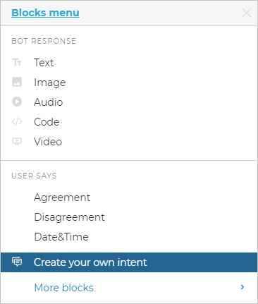 A part of built-in intents is placed in the User says section of the block menu. To see the whole list of built-in intents, open the More blocks submenu.